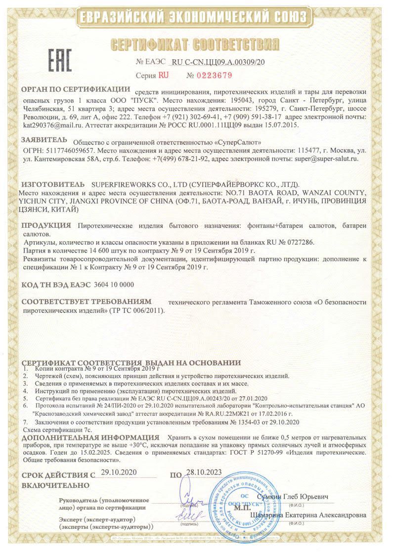 Эффекты:Красные и зеленые звезды с пушистыми шлейфами сопровождаются серебряным мерцанием.Золотые волны с красными жемчужинами.Золотые волны с зелеными жемчужинами.Золотые ивы с серебряными нитями и мерцанием.Золотые волны с пурпурным и изумрудным мерцанием.Красные и синие звезды с серебряными шлейфами.Золотые волны с фиолетовыми жемчужинами.Золотые трещащие шлейфы с изумрудным и серебряным мерцанием.Золотые волны с белым мерцанием.Свистящие рыбки.Разноцветные кокосы переходят в огромное трещащее облако.