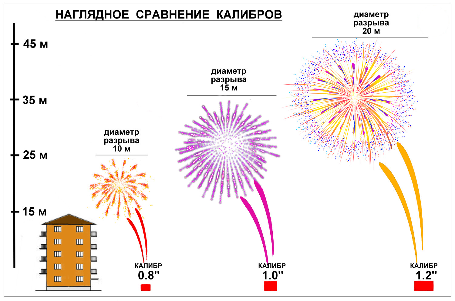 Для того чтобы решить, какой калибр салюта (фейерверка) подойдёт для вашего мероприятия, просто сравните характерные параметры калибров бытовой пиротехники